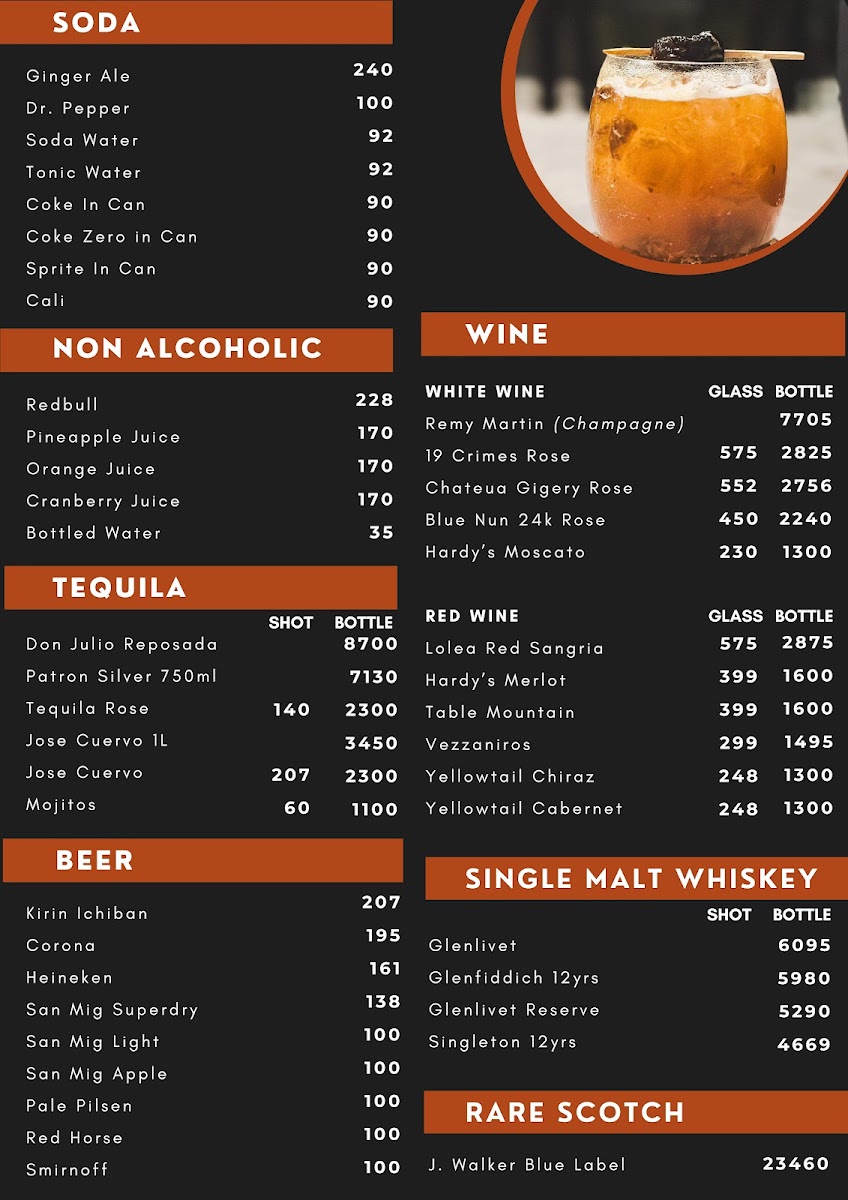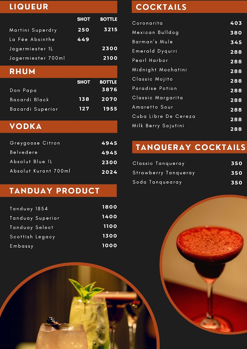 Drinks feature several coffee styles, such as Americano, Café Latte, Pour Over (offering Tanzania and Bukidnon beans), Spanish Latte, and Espresso Con Panna. These choices cater to those seeking classic and specialty coffee experiences, ideal for morning or afternoon consumption.