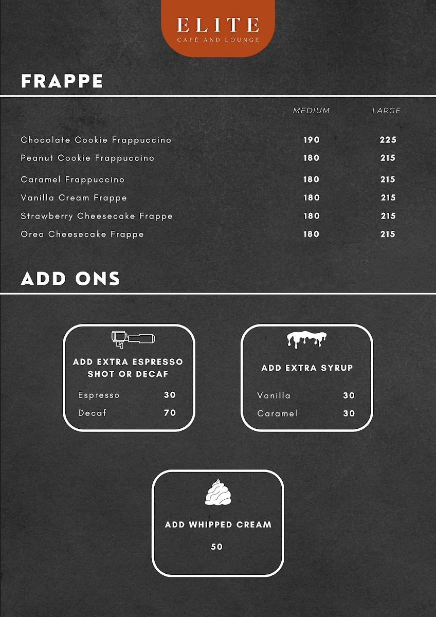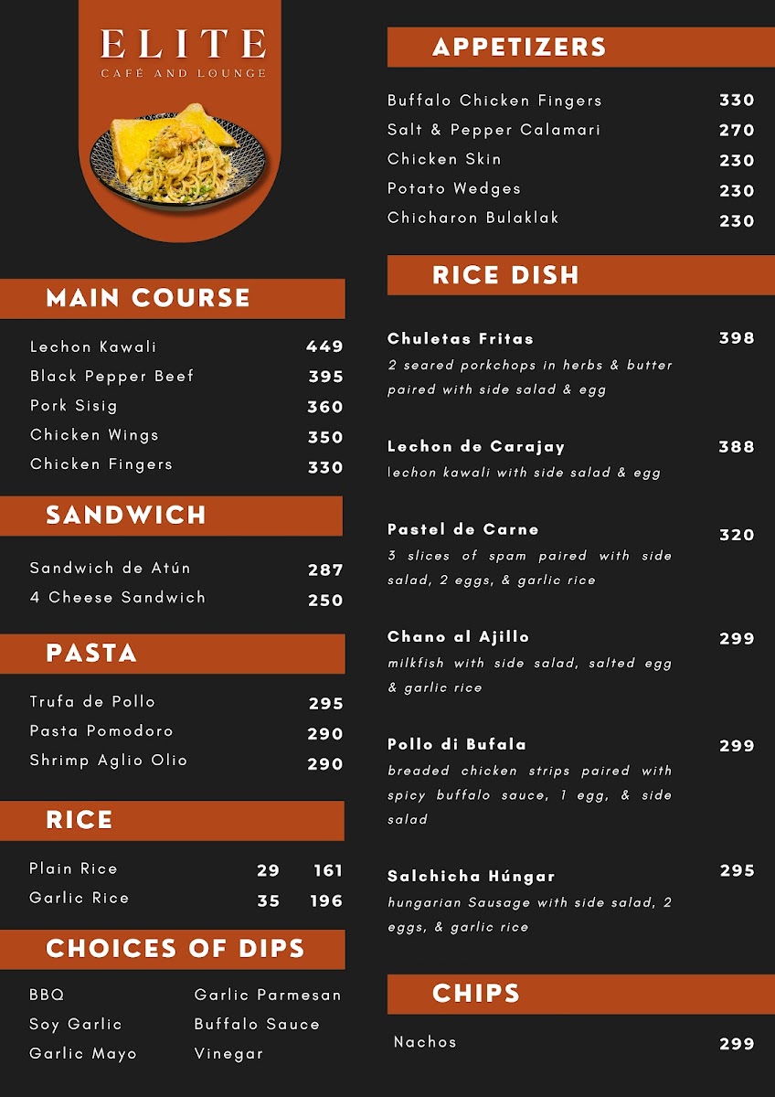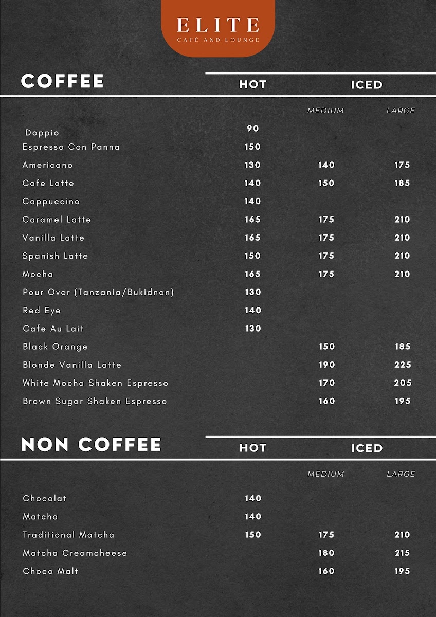 The menu at Elite Café and Lounge presents a variety of options suitable for coffee breaks, light meals, and casual dining. The selection includes both hot and specialty coffee drinks, appetizers, and pasta dishes, allowing visitors to choose according to their preference and time of day.